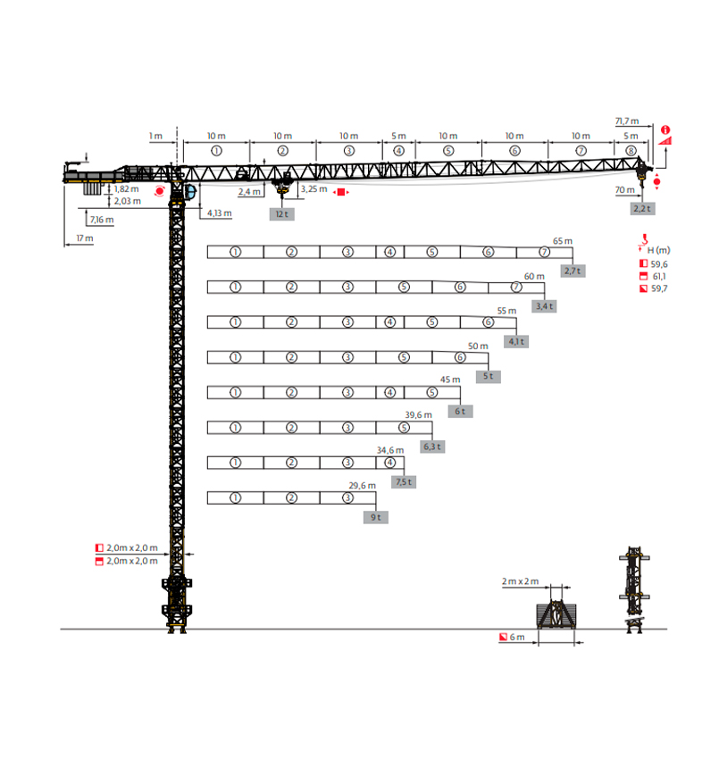 • Maximum lifting capacity at the end of the arm